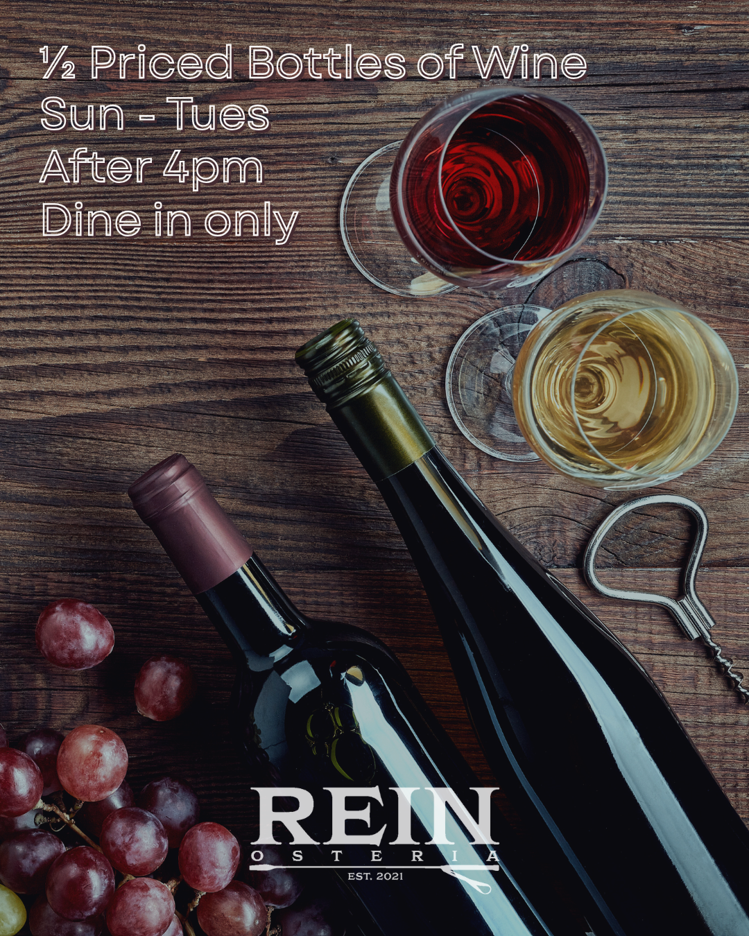 Settle in with us Sunday through Tuesday after 4pm for Uncorked Evenings at Rein. Enjoy half-priced bottles of wine (bottles under $100), available for dine-in guests only.